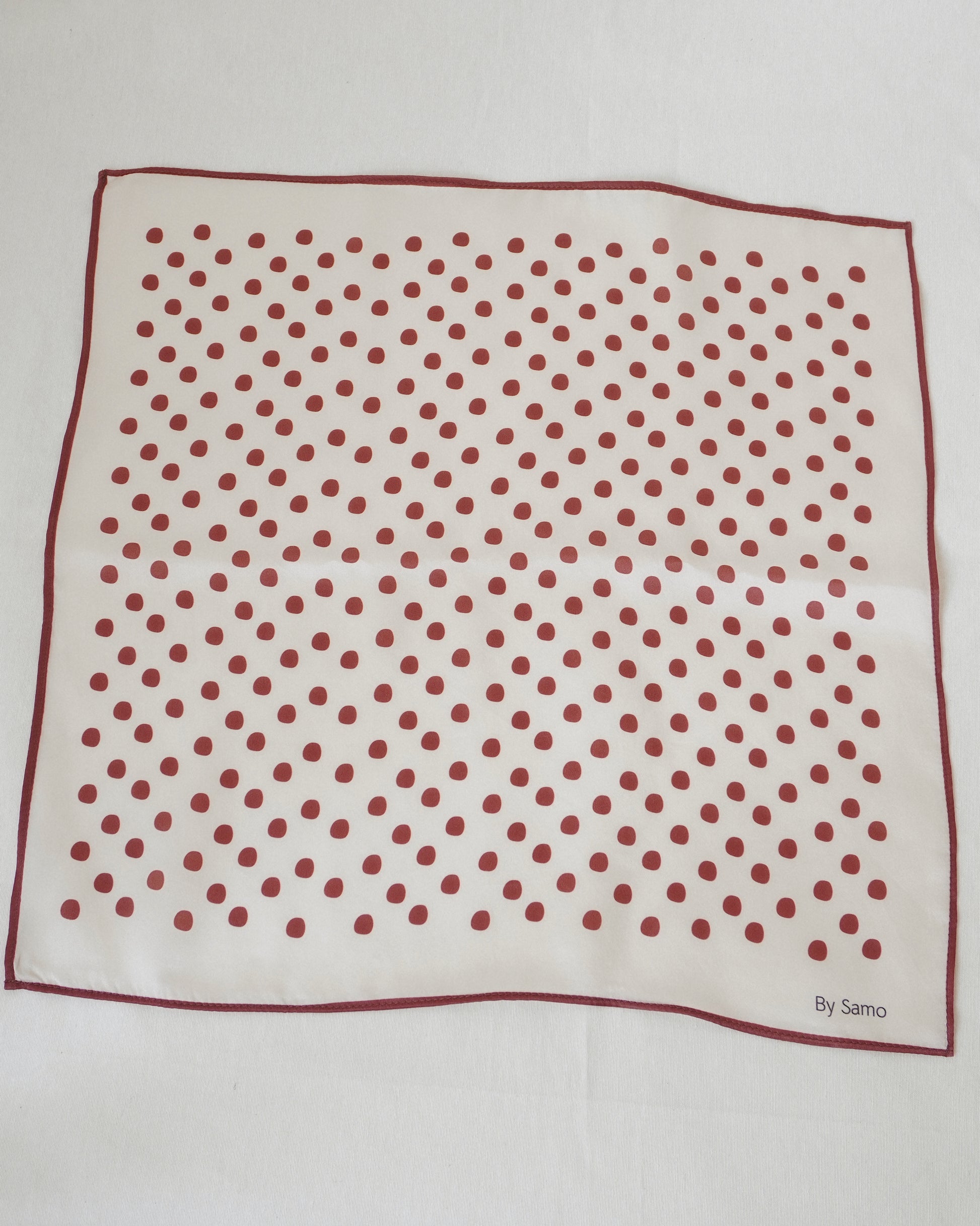 - Its design features burgundy polka dots on a crisp white background, finished with delicately hand-rolled edges.